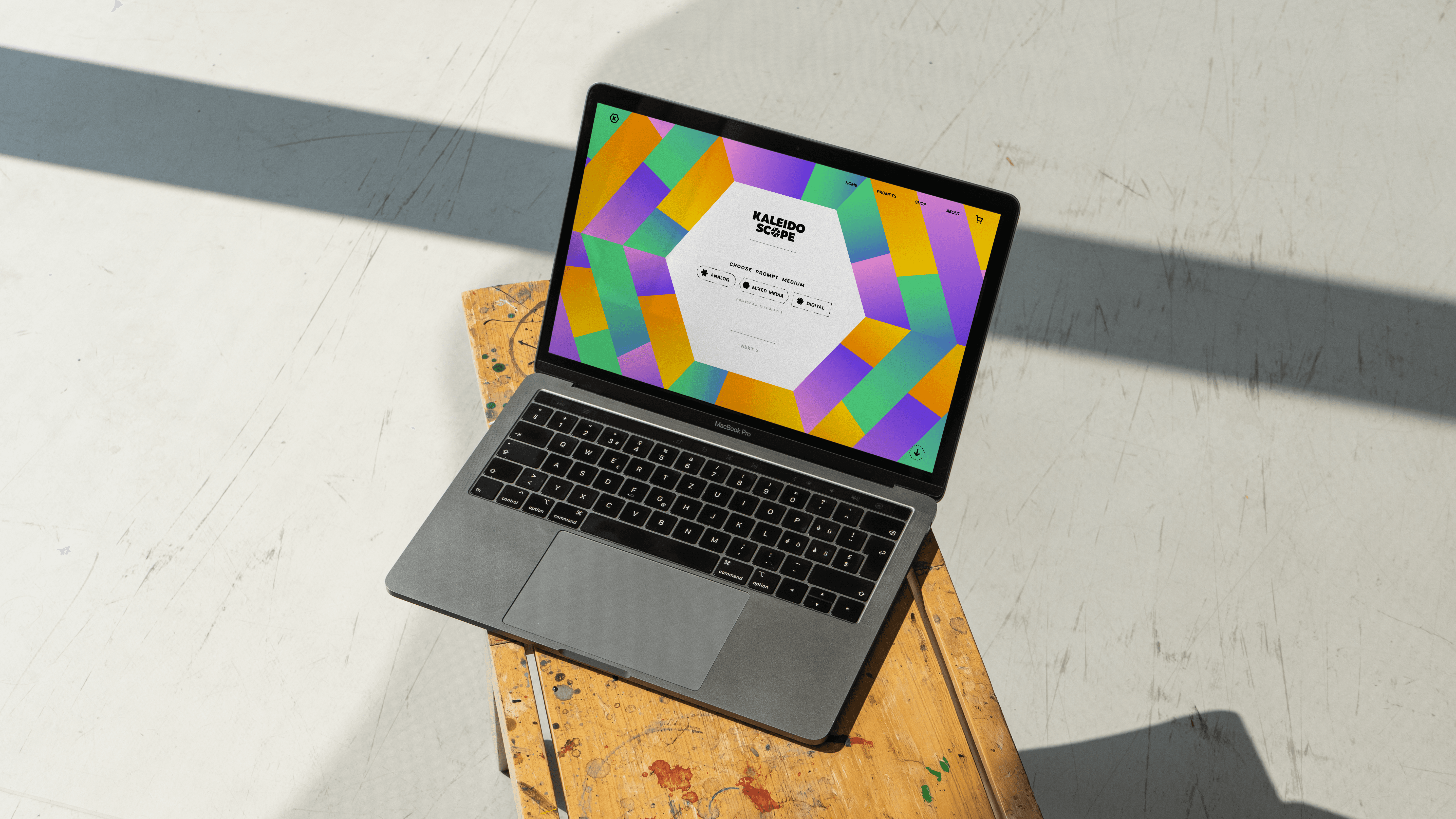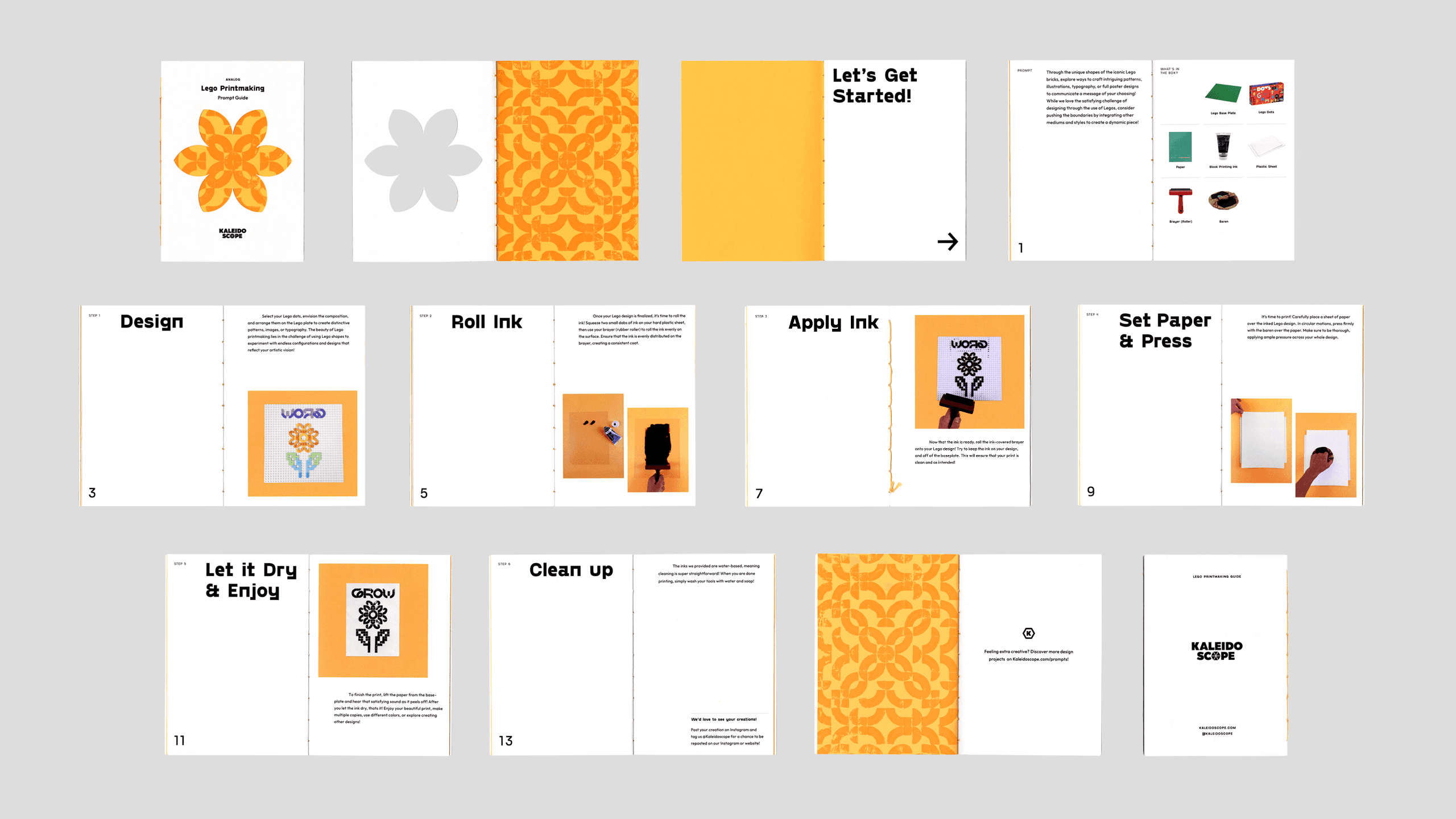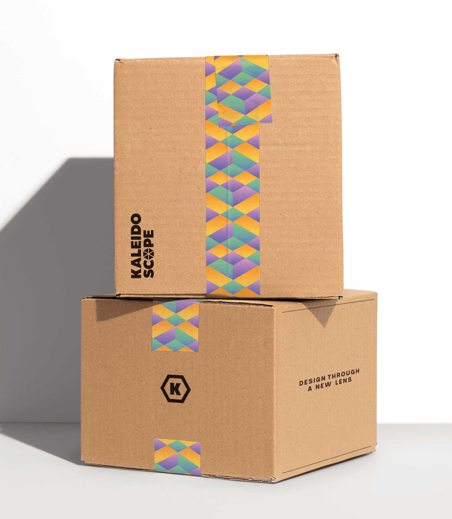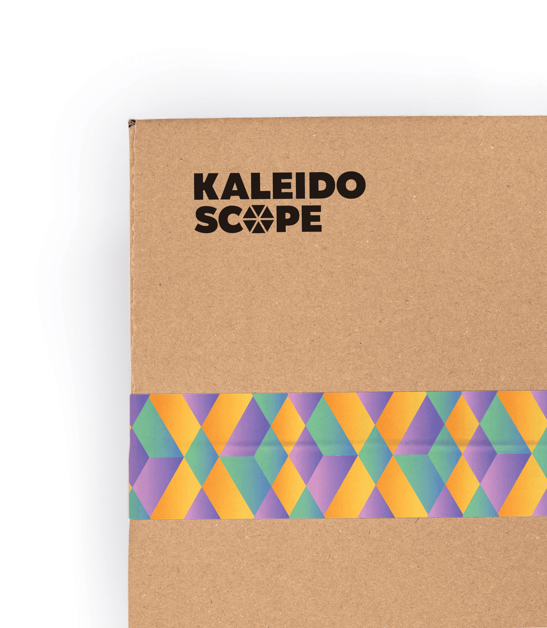 Kaleidoscope's three brand shapes identify a prompt's medium; analog, digital, or mixed media. The shapes are designed using the logotype hexagon mark as a grid. This dynamic approach to the logo and identity design is inspired by the reflective patterns and fun-shaped beads typically found in a kaleidoscope.